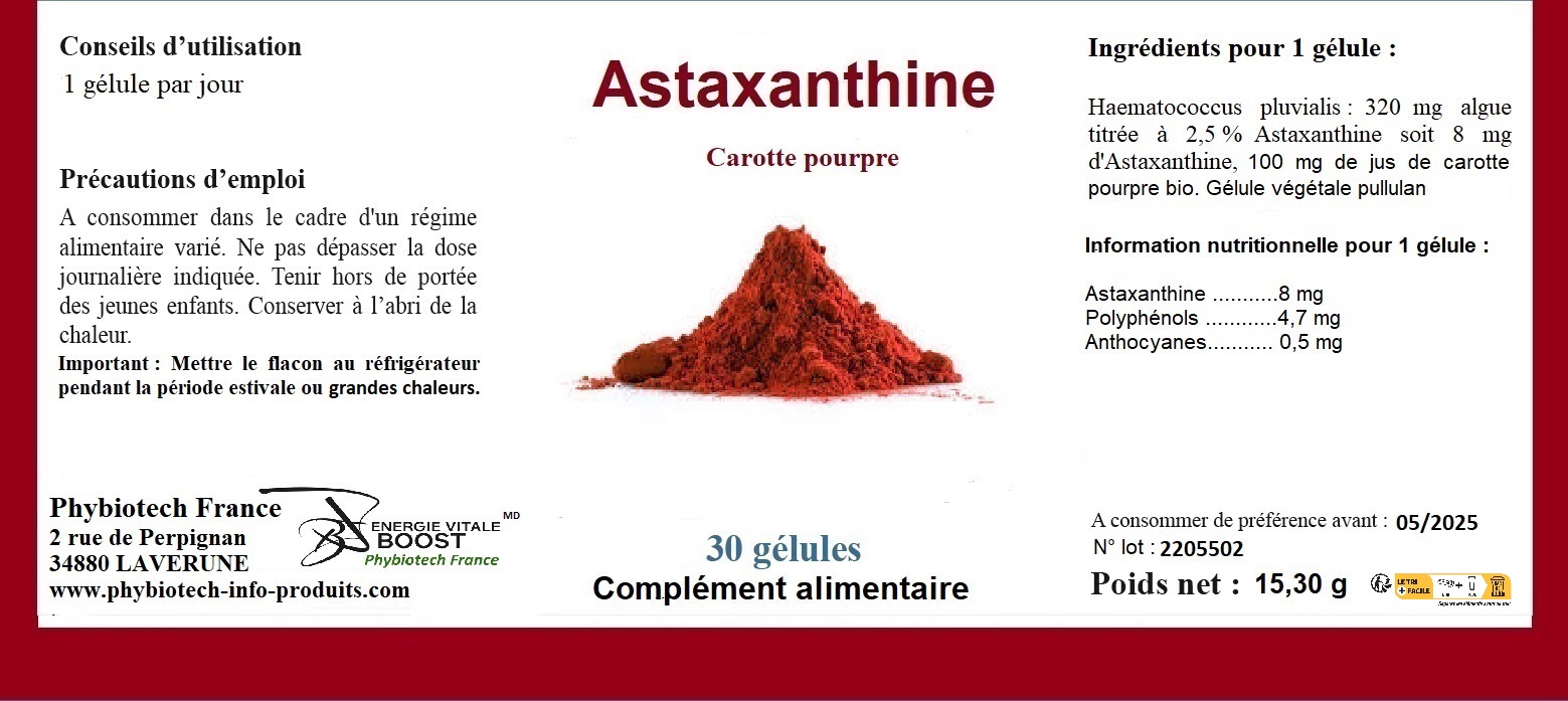 - 640 mg d’Haematococus pluvialis titré à 2,5% soit 16 mg d’astaxanthine