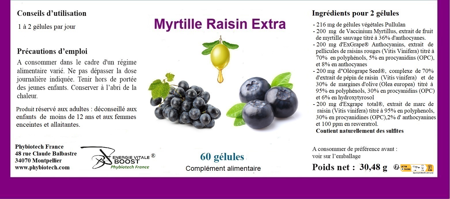- 200 mg d’ExGrape Total®, extrait de marc de raisin (Vitis Vinifera), titré à 95% en polyphenols, 30% en procyanidins (OPC), 2% d’anthocyanines et 100 ppm en resveratrol